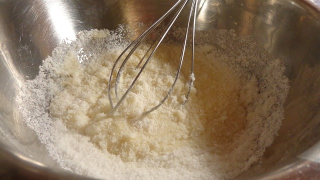 Σε μπολ ρίχνουμε το γάλα και με ένα κουτάλι προσθέτουμε και ανακατεύουμε την καρύδα να γίνει ένα σφιχτό μείγμα και να πλάθεται.