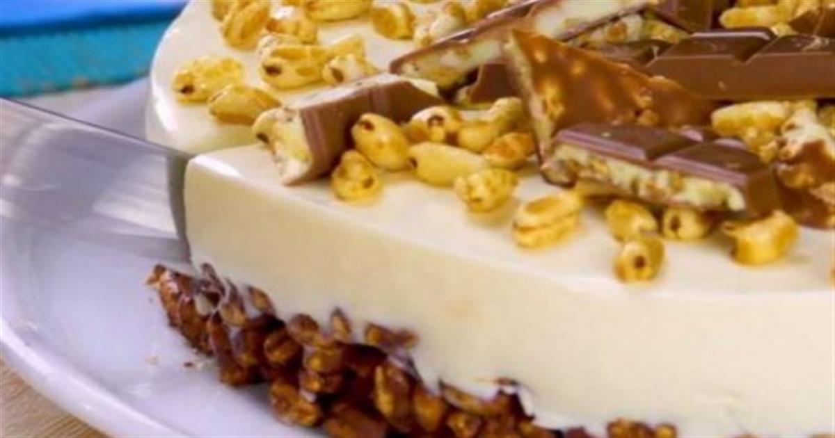 1. Ξεκινάτε λιώνοντας την κουβερτούρα σε μπεν μαρί. Προσέχετε το βραστό νερό να μην ακουμπάει την βάση του μπολ. Ρίχνετε τα δημητριακά στο μπολ με τη λιωμένη σοκολάτα και απλώνετε το μείγμα στη βάση μιας φόρμας με αποσπώμενα τοιχώματα. Αφήνετε τη βάση να παγώσει ώσπου να σκληρύνει.
