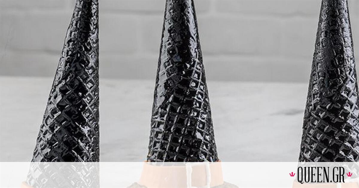 Υλικά: 6 χωνάκια παγωτού10 γρ. μαύρο χρώμα ζαχ/κής σε πάστα300 γρ. κουβερτούρα120 γρ. βούτυρο, σε θερμοκρασία δωματίου250 γρ. ζάχαρη άχνη1/2 κ.γ. εκχύλισμα βανίλιας1-2 κ.σ. γάλα160 γρ. μπισκότα β…