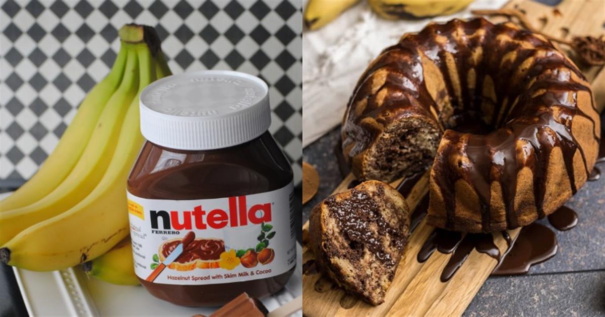 – Χτυπάμε στο κάδο του μίξερ όλα τα υλικά εκτός από τα 4 τελευταία. – Εν’ τω μεταξύ προθερμαίνουμε το φούρνο στους 180 βαθμούς Κελσίου. – Βουτυρώνουμε και λαδώνουμε μια μεγάλη στρογγυλή φόρμα κέικ και ρίχνουμε μέσα το μισό μείγμα. – Προσθέτουμε από πάνω τη μπανάνα σε φετούλες και τη Nutella και ρίχνουμε από πάνω το άλλο μισό μείγμα ζύμης. – Ψήνουμε στο προθερμασμένο φούρνο για πενήντα λεπτά. – Λιώνουμε τη κουβερτούρα με τη κρέμα γάλακτος και περιχύνουμε το κέϊκ μόλις το βγάλουμε από το φούρνο. Εξ’ ίσου υπέροχο είναι και χωρίς το γλάσο σοκολάτας.