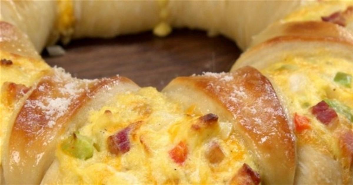 • Προσθέστε τα αβγά και ανακατέψτε μέχρι να αρχίσουν να σφίγγουν και στην συνέχεια ρίξτε το μπέικον, τα τυριά και ανακατέψτε ξανά.