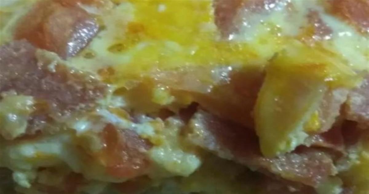 - Σε μπολ χτυπάμε τα αυγά και προσθέτουμε τις ντομάτες, το σαλάμι, το κρεμμύδι κομμένα σε κύβους και το τυρί. Ανακατεύουμε.