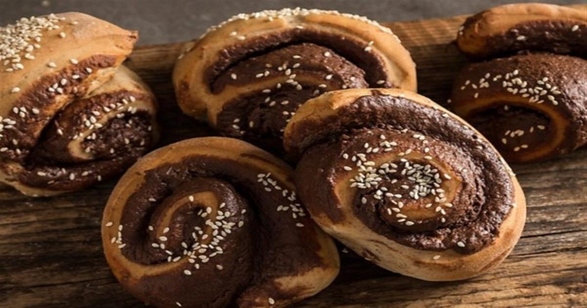 6) Προσεκτικά τυλίγουμε τη ζύμη με τη γέμιση προς τα μέσα, έτσι ώστε να έχουμε ένα μακρόστενο ρολό. Κόβουμε 10 ροδέλες ίσου πάχους και τις τοποθετούμε σε ταψί περασμένο με λαδόκολλα, αφήνοντας μεταξύ τους ένα μικρό κενό. Τις πασπαλίζουμε με σουσάμι, τις καλύπτουμε και τις αφήνουμε να φουσκώσουν σε ζεστό μέρος για 20 λεπτά.