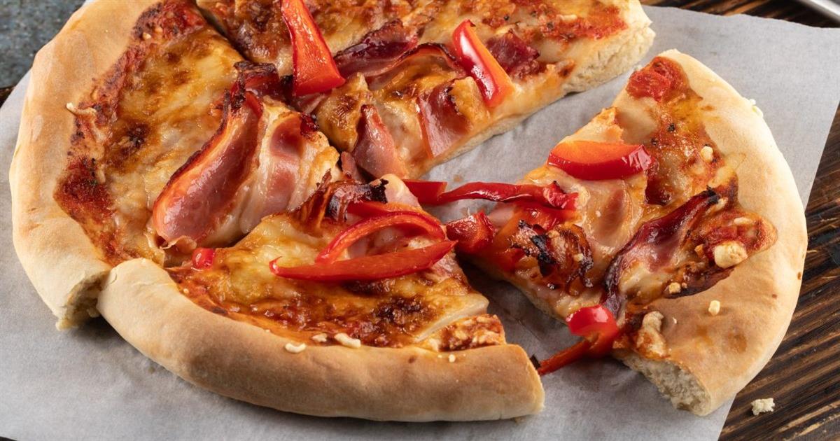 • Στη συνέχεια απλώνουμε επάνω στη ζύμη τη σάλτσα, το τυρί, το μπέικον και την πιπεριά και ψήνουμε για ακόμη 5 λεπτά.