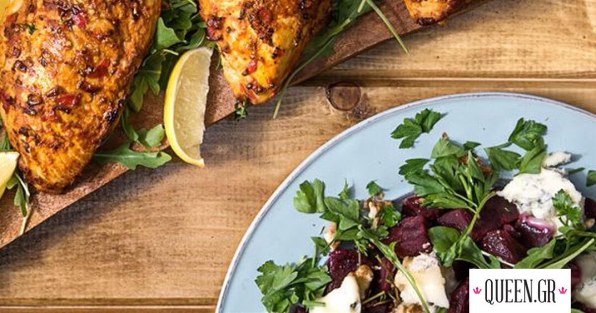 Πικάντικο κοτόπουλο Harissa από τον Άκη Πετρετζίκη. Φτιάξε καuτερό κοτόπουλο με τσίλι και συνόδευσέ το με σαλάτα από παντζάρια και τυρί γκοργκοντζόλα.