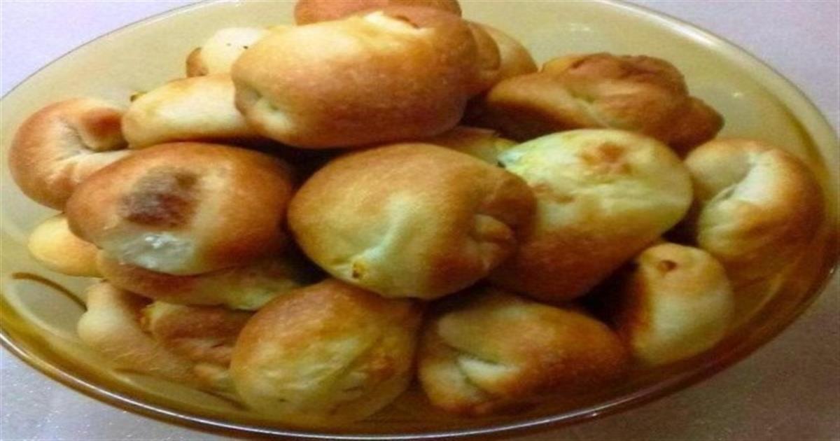 • Κόβετε λίγη ζύμη, την κάνετε μπαλίτσα, την ανοίγετε σε φύλλο, βάζετε στη μέση του μια κουταλιού γέμιση, την κλείνετε σαν πουγκάκι, έπειτα πατάτε την ένωση προς τα μέσα και το τοποθετείτε με την ένωση προς τα κάτω σε ένα ταψί που έχετε βάλει προηγουμένως ένα φύλλο λαδόκολλα.