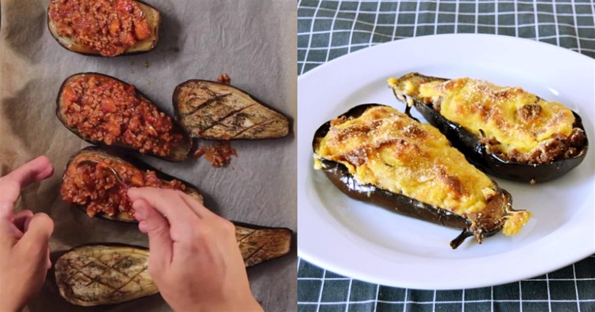 – Για τα παπουτσάκια: Γεμίζουμε τη σκαφτή μέση της μελιτζάνας με κιμά κ από πάνω ρίχνουμε μπεσαμέλ κ τυρί τριμμένο. Ψήνουμε στη μεσαία σχάρα, στις αντιστάσεις ώσπου να ροδίσουν.