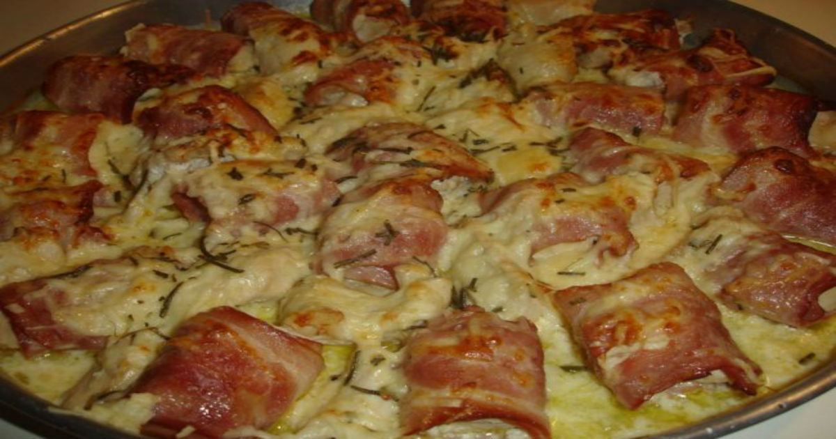 Κόβουμε τα φιλέτα κοτόπουλου σε μεγάλους κύβους και τους βάζουμε σε κατσαρόλα να βράσουν ελαφρά για 15 περίπου λεπτά, μαζί με το κρεμμύδι, το καρότο, τα φύλλα δάφνης, αλάτι και μία κουταλιά της σούπας ελαιόλαδο. Κατόπιν τα σουρώνουμε, τυλίγουμε κάθε κομμάτι με μία λωρίδα μπέικον και τα τοποθετούμε σε ταψί. Όταν τελειώσουμε με το τύλιγμα πασπαλίζουμε με τα τυριά, ρίχνουμε πιπέρι, το δεντρολίβανο και απλώνουμε την κρέμα γάλακτος να πάει παντού, βάζουμε τους κύβους βουτύρου σε διαφορετικά σημεία και ψήνουμε για 20 λεπτά σε κανονικό φούρνο.