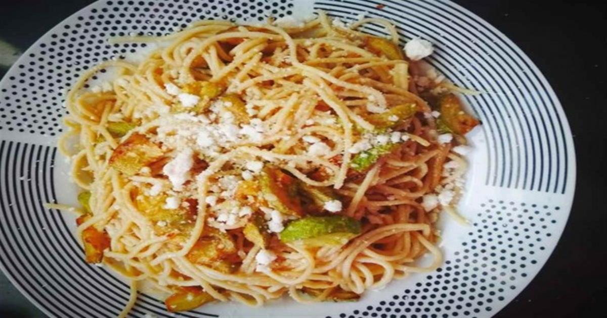 - Αφού αρχίσουν να παίρνουν χρώμα τα κολοκυθάκια, ρίχνω μερικές σκελίδες σκόρδο και τις τριγυρίζω, να δώσουν άρωμα. Έπειτα ρίχνω στο τηγάνι τα έτοιμα μακαρόνια και δυόσμο ή βασιλικό.