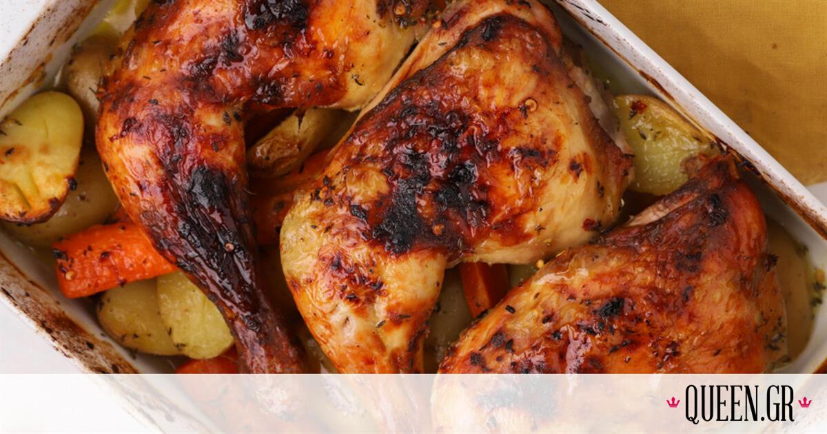 4 μπούτια κοτόπουλου, με το δέρμα τους500 γρ. πατάτες baby, κομμένες στη μέση200 γρ. καρότα, κομμένα στα 41 σκ. σκόρδο, ψιλοκομμένη2 κ.σ. μουστάρδα dijon2 κ.σ. μουστάρδα, απαλή1 κ.σ. φρέσκο θυμάρι, μό…