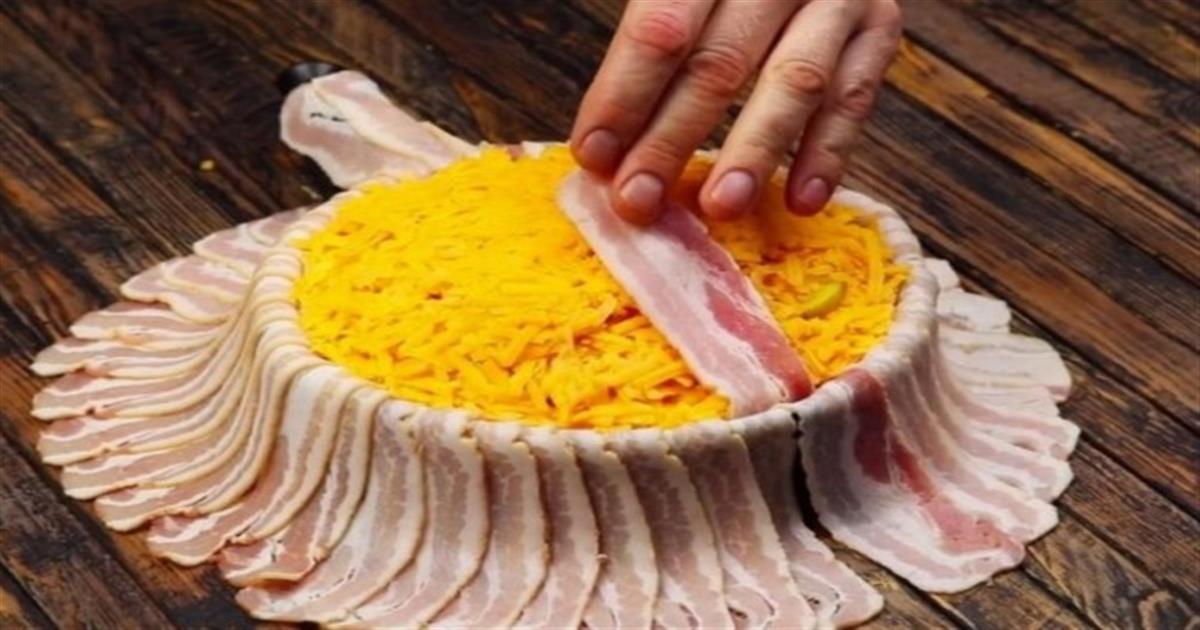Τοποθετήστε τις φέτες μπέικον σε ένα ταψί, έτσι ώστε να επικαλύπτονται και να σχηματίζουν κύκλο. Τα άκρα πρέπει να εξέχουν πάνω από την άκρη του ταψιού και η επιφάνεια του ταψιού να καλύπτεται.