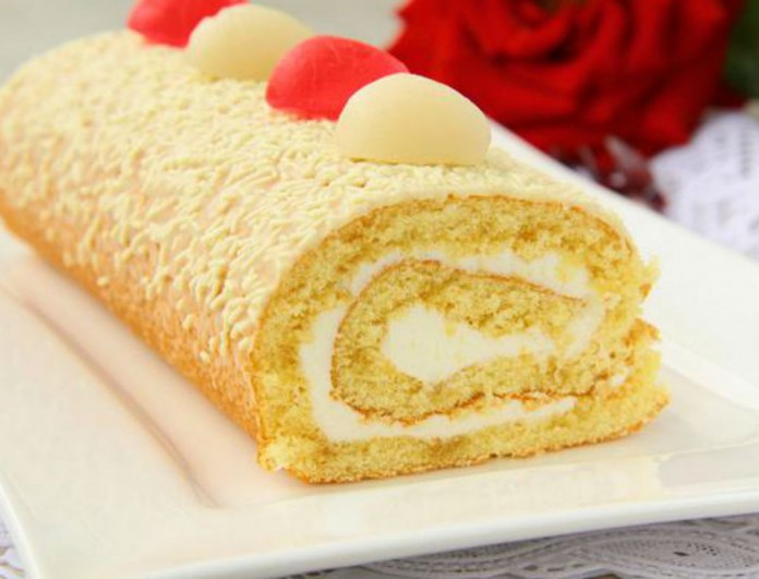 Αδειάζουμε το μείγμα μας σε ταψί που βάλαμε λαδόκολλα και ψήνουμε σε προθερμασμένο φούρνο στους 180 βαθμούς για περίπου 15 – 20 λεπτά, μέχρι να ροδίσει (με μια οδοντογλυφίδα δοκιμάζουμε να το τρυπήσουμε κι αν βγει καθαρή είναι έτοιμο). Μόλις το βγάλουμε από τον φούρνο το τυλίγουμε μαζί με την λαδόκολλα σε ρόλο και το αφήνουμε στην άκρη.