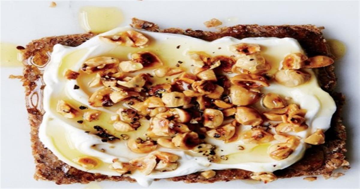 - Αλείφουμε με γιαούρτι μια λεπτή φρυγανισμένη φέτα πολύσπορο ψωμί και απλώνουμε από πάνω μερικά από τα φουντούκια που μόλις ετοιμάσαμε.