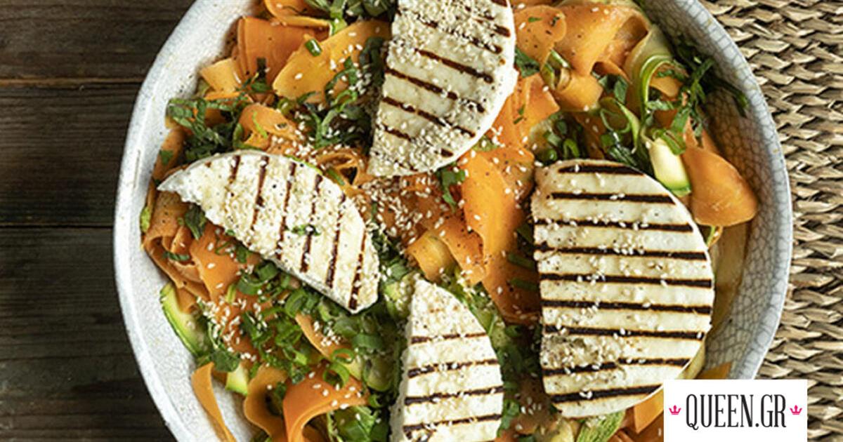 Σαλάτα λαχανικών με ψητό μανούρι από τον Άκη Πετρετζίκη. Φτιάξε την πιο νόστιμη σαλάτα με καρότο, κολοκύθι, μανούρι και σάλτσα με ταχίνι.