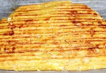 Αφαιρείτε το αλουμινόχαρτο και συνεχίζετε το ψήσιμο για 10-15 λ περίπου ή μέχρι να ροδίσει ελαφρώς η επιφάνειά του. Το βγάζετε από το φούρνο το αφήνετε να κρυώσει ελαφρώς και στη συνέχεια το ξεφορμάρετε, το κόβετε σε κομμάτια και σερβίρετε.