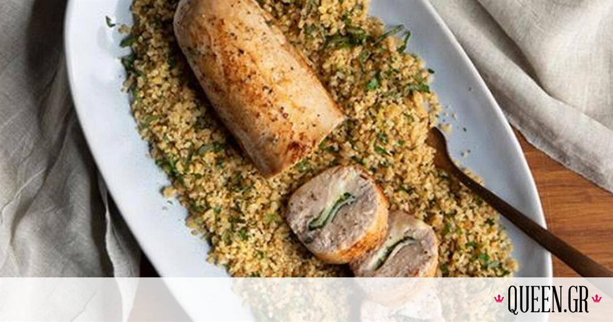 Γεμιστή μπαλοτίνα κοτόπουλου και πλιγούρι από τον Άκη Πετρετζίκη. Συνταγή για ρολό με μοτσαρέλα, γαλοπούλα και σπανάκι.