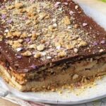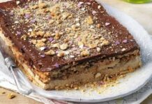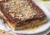 - Ψήνουμε σε προθερμασμένο φούρνο στους 180 βαθμούς για 30 λεπτά περίπου μέχρι να ροδοκοκκινίσει. Τη βγάζουμε από το φούρνο, την αφήνουμε για 10 λεπτά στο ταψί να “σταθεί”, τη κόβουμε σε κομμάτια και σερβίρουμε.