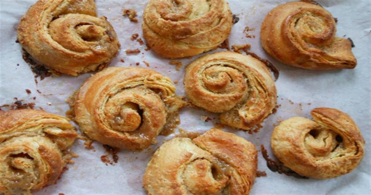 - Τυλίγουμε τις λωρίδες σε σχήμα σαλιγκαριού κα τις τοποθετούμε σε ένα αντικολλητικό ταψί. Πριν το ψήσιμο, με ένα πινέλο, απλώνουμε πάνω στα πιτάκια ταχίνι, ζάχαρη και κανέλα.