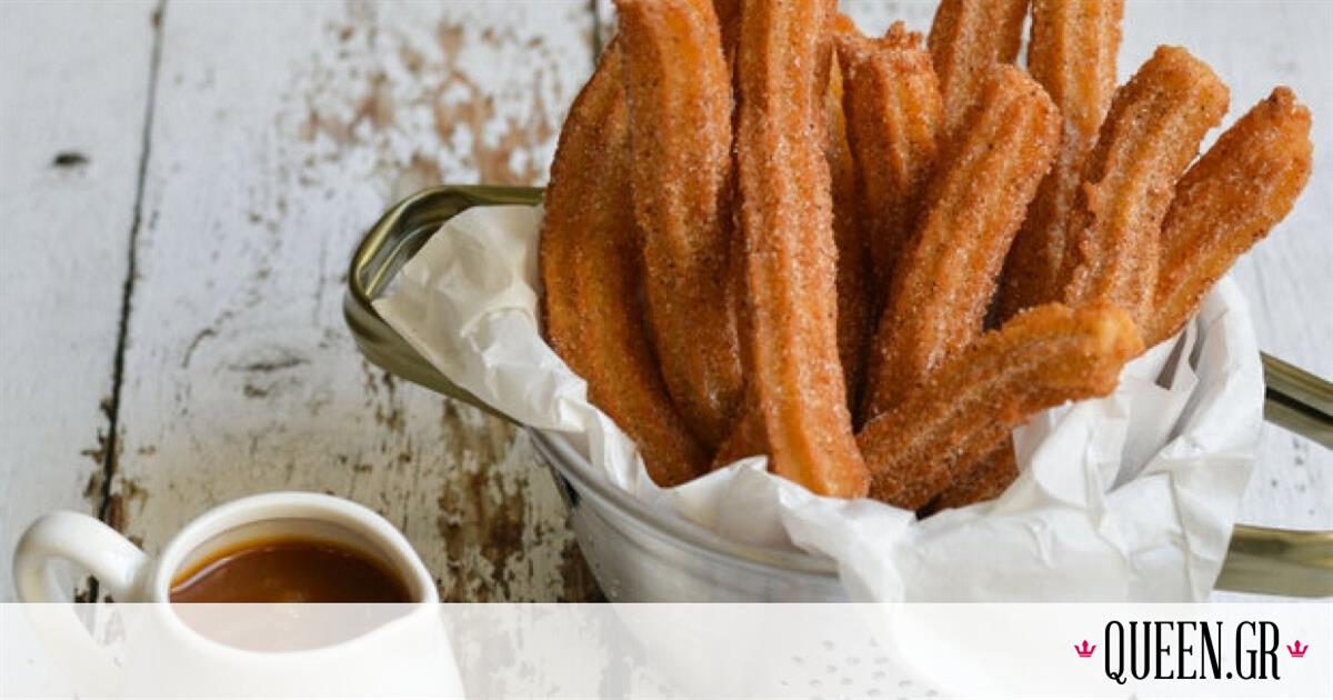 Υλικά για τα churros:200 ml Νερό100 γρ. Βούτυρο6 γρ. Ζάχαρη, κρυσταλλική3 Αυγά150 γρ. Aλεύρι γ.ο.χ2 γρ. ΑλάτιΗλιέλαιο για το τηγάνισμα Υλικά για τη καραμέλα βουτύρου:150 γρ. Ζάχαρη, κ…