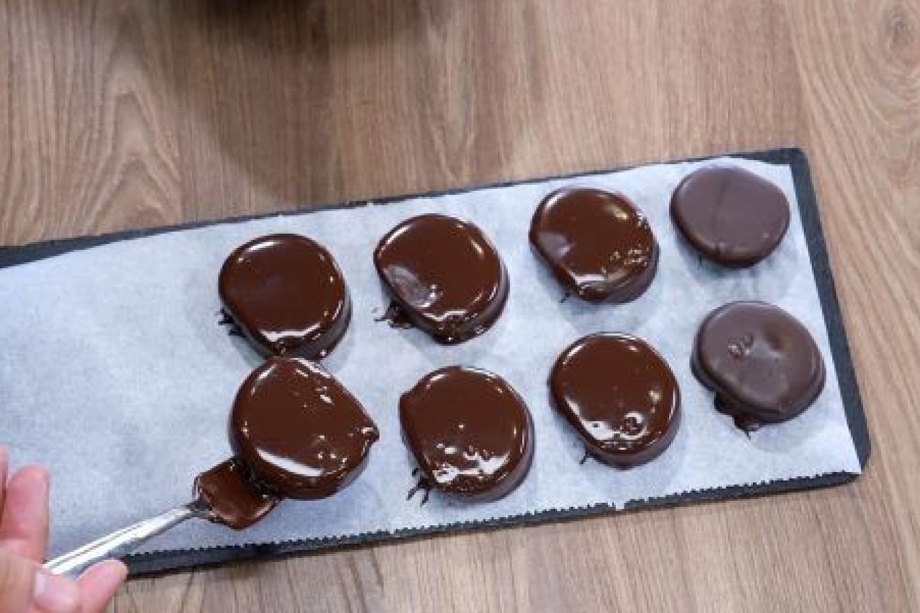 Το κόβουμε σε κομμάτια και λιώνουμε την κουβερτούρα, προσθέτοντας 1 κουταλιά της σούπας ηλιέλαιο προαιρετικά. Βουτάμε τα κομμάτια μέσα στη λιωμένη κουβερτούρα και περιμένουμε μέχρι να σταθεροποιηθεί η σοκολάτα.