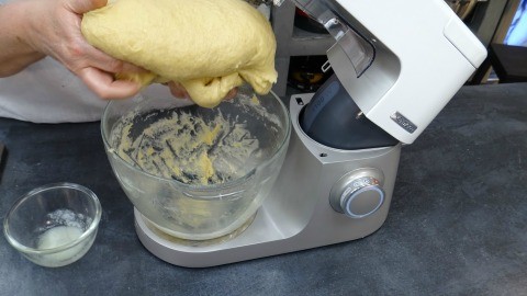 Στον κάδο της κουζινομηχανής βάζουμε το αλάτι, το αλεύρι, την ενεργοποιημένη μαγιά και το μαχλέπι με τη μαστίχα (τριμμένα σε σκόνη). Προσθέτουμε τα υγρά υλικά. Ζυμώνουμε με το γάντζο ζυμώματος της κουζινομηχανής για 10 λεπτά μέχρι η ζύμη να σηκώνεται όλη μαζί και να σχηματίζει κόρδες. Δεν πρέπει να κολλάει στα χέρια. Πρέπει να είναι απαλή, βουτυράτη και να πέφτει. Να μην είναι σφιχτή.