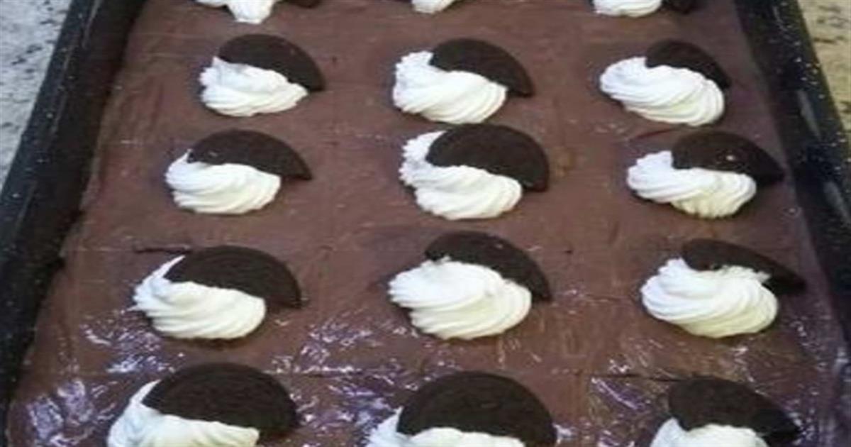 - Ρίχνουμε την κρέμα από πάνω σκεπάζουμε με μεμβράνη και βάζουμε το γλυκό στο ψυγείο για 6 ώρες. Το σερβίρουμε όταν σταθεροποιηθεί. Αν θέλουμε το στολίζουμε με σαντιγί, κακάο και κάποιο μπισκότο. Έτοιμο! Καλή επιτυχία!
