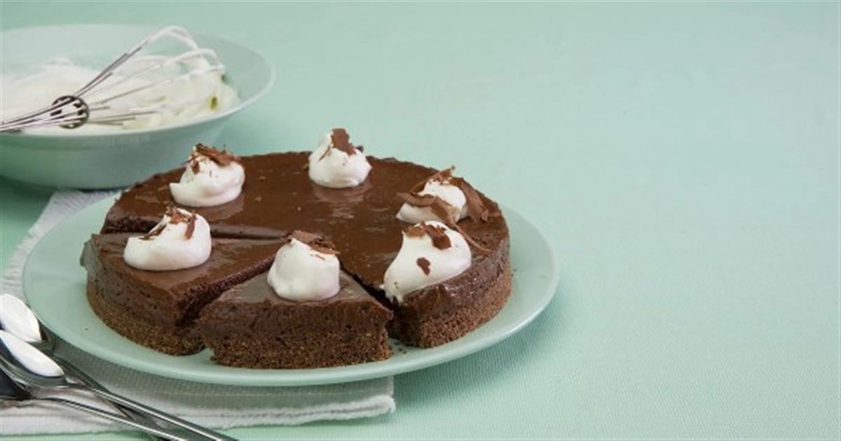 με σπάτουλα σιλικόνης, αφήστε να λιώσει η σοκολάτα και αποσύρετε. Σε ένα μπολ χτυπήστε τα ασπράδια με αυγοδάρτη, μέχρι να αφρίσουν. Κατόπιν προσθέστε την καστανή ζάχαρη ανακατεύοντας μέχρι να έχετε ένα λείο, παχύρρευστο μείγμα. Ενσωματώστε το μείγμα στις σοκολάτες, ανακατεύοντας με σπάτουλα σιλικόνης. - Ρίξτε το μείγμα σοκολάτας στο τσέρκι και βάλτε το ξανά στο ψυγείο, για περίπου 3 ώρες. Βγάλτε το κέικ από το ψυγείο και ακουμπήστε το σε μια πιατέλα. Περάστε το περιμετρικά με ένα μαχαιράκι, για να ξεφορμάρετε πιο εύκολα. Ανασηκώστε προσεκτικά το τσέρκι και ξεφορμάρετε. Πάρτε κουταλιές από την έτοιμη φυτική σαντιγί