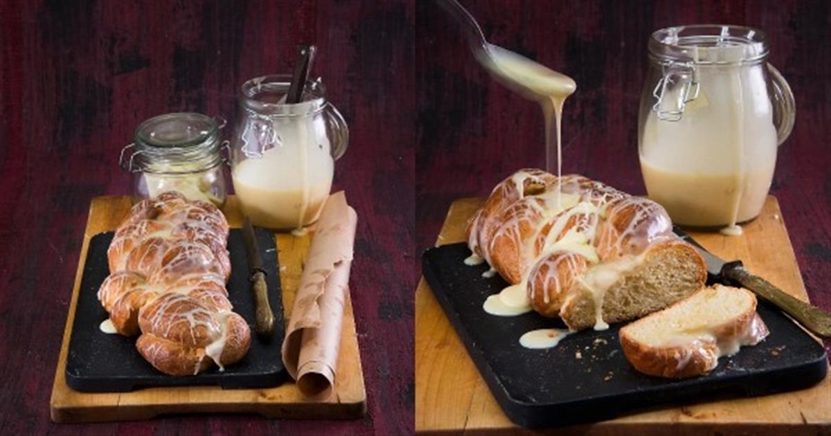 - Γλασάρετε το τσουρέκι περιχύνοντάς το με την επικάλυψη, μεταφέρετε σε μια πιατέλα και σερβίρετε.