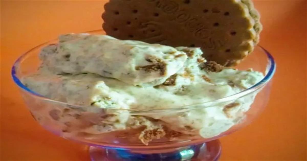 • Τέλος, ρίχνουμε τα τριμμένα μπισκότα και αφήνουμε το μείγμα για 2 ώρες στην κατάψυξη. Σερβίρουμε με σιρόπι της αρεσκείας μας ή γλυκό του κουταλιού!