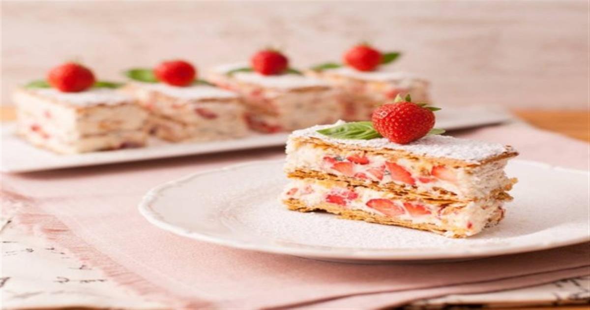 «Κολασμένο» μιλφέιγ γλυκό ψυγείου με μαριναρισμένες φράουλες, κρέμα τυριού και αμύγδαλα