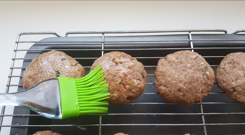Λαδώστε με ένα πινέλο την σχάρα. Πλάστε τα μπιφτέκια και τοποθετήστε τα πάνω. Με το ίδιο πινέλο λαδώστε τα κι αυτά.