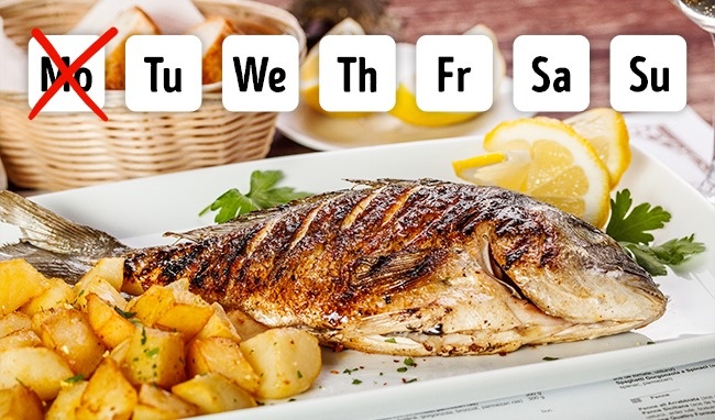 Σύμφωνα με τον σεφ Anthony Bourdain, η πλειοψηφία των εστιατορίων αγοράζουν τα ψάρια τους τις μέρες προς το Σαββατοκύριακο: Πέμπτη ή Παρασκευή. Οι αγορές ψαριών συνήθως παραμένουν κλειστές τη διάρκεια του Σαββατοκύριακου, και τα ψάρια μπορούν να παραμείνουν φρέσκα μόνο για τρεις ημέρες. Πράγμα που σημαίνει ότι, αν αποφασίσετε να φάτε ένα πιάτο με ψάρι τη Δευτέρα, θα φάτε είτε κάτι μπαγιάτικο είτε κάτι από την κατάψυξη.
