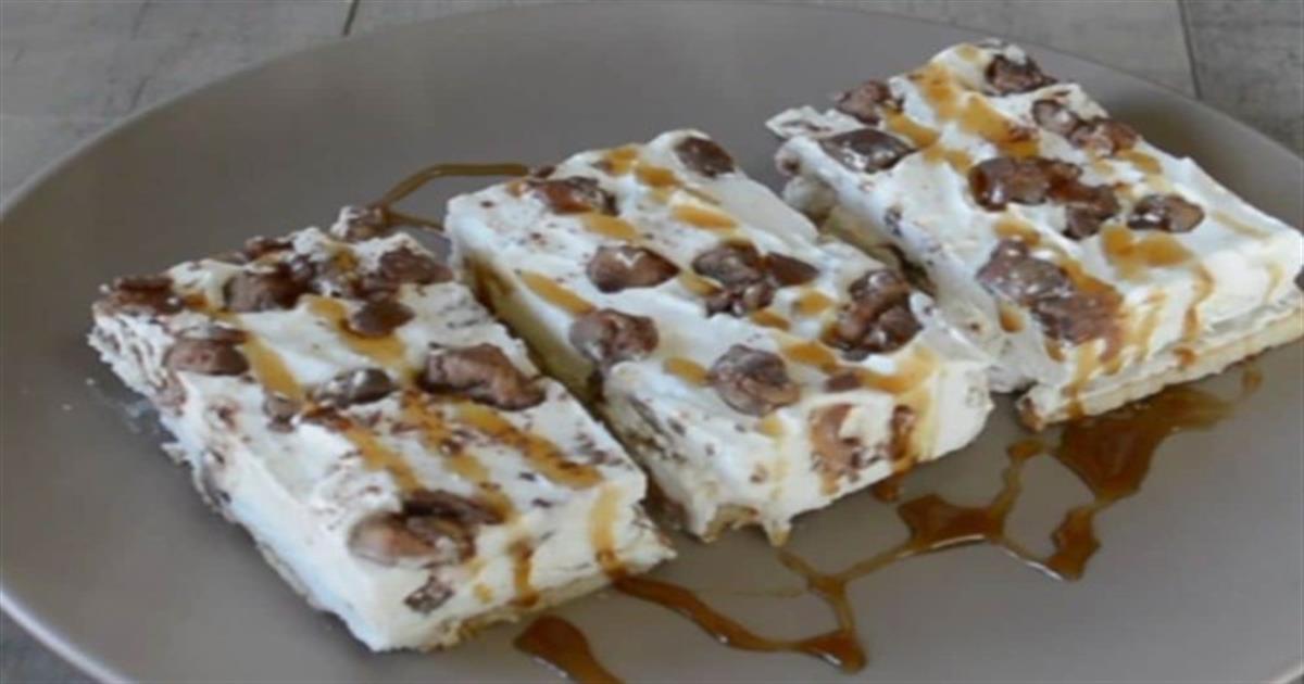 • Τα βάζετε στη κατάψυξη για ένα βράδυ, ή μέχρι να σταθεροποιηθεί και παγώσει καλά το μείγμα. Πριν σερβίρετε βγάζετε το γλυκό σας από τη κατάψυξη το αφήνετε για 10 λ σε θερμοκρασία δωματίου και μετά το κόβετε σε κομμάτια και σερβίρετε.
