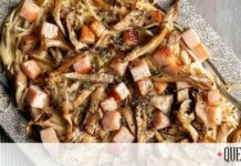 Τρυπάμε την επιφάνεια του φύλλου με ένα πιρούνι και κόβουμε βαθιά σε κομμάτια.