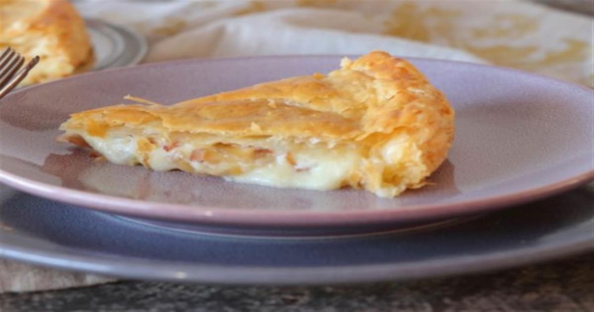 Τυρόπιτα σφολιάτας με καραμελωμένα κρεμμύδια και τραγανό μπέικον! (Video)