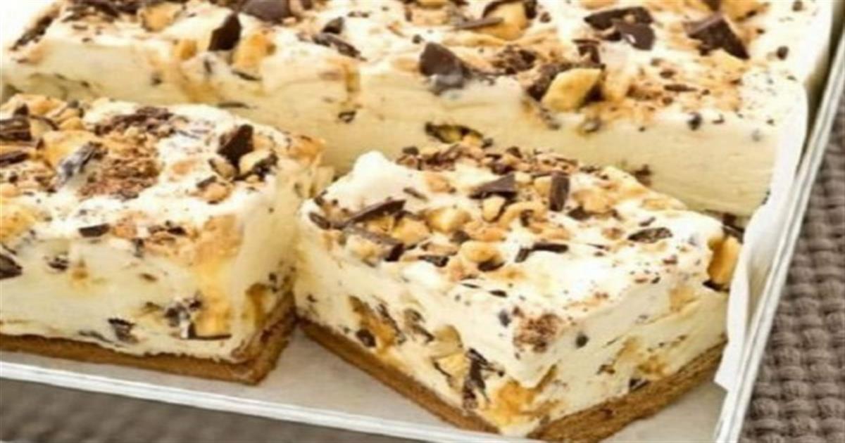 - Τα βάζετε στη κατάψυξη για ένα βράδυ, ή μέχρι να σταθεροποιηθεί και παγώσει καλά το μείγμα. Πριν σερβίρετε βγάζετε το γλυκό σας από τη κατάψυξη, το αφήνετε για 10 λ σε θερμοκρασία δωματίου και μετά το κόβετε σε κομμάτια και σερβίρετε.