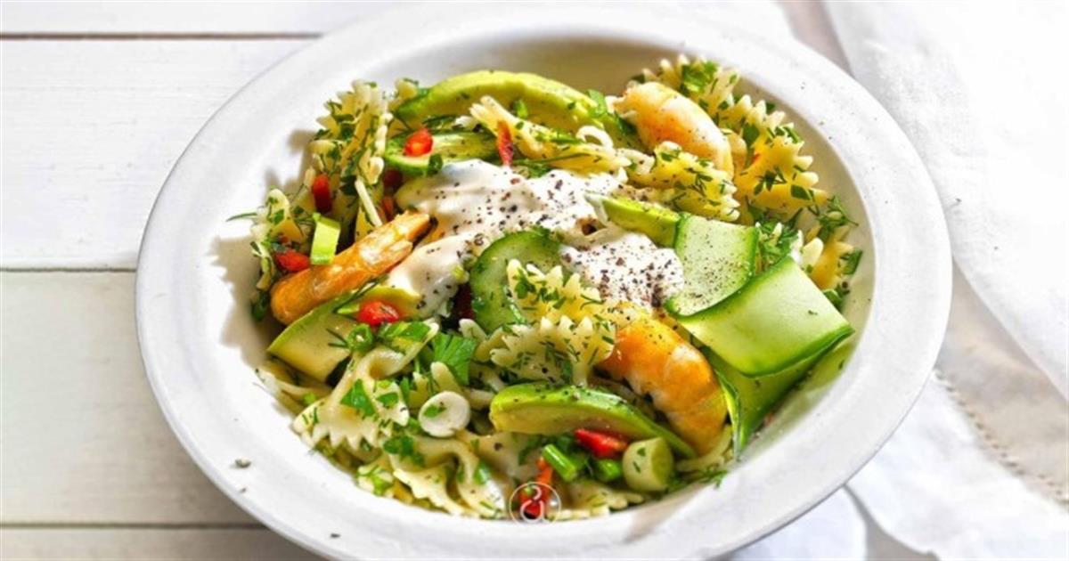 - Στη συνέχεια βάζουμε τα ζυμαρικά σε σαλατιέρα μαζί με το αγγούρι, την πιπεριά, τον άνηθο, το μαϊντανό, το αβοκάντο, τα ψιλοκομμένα κρεμμυδάκια και τις γαρίδες.