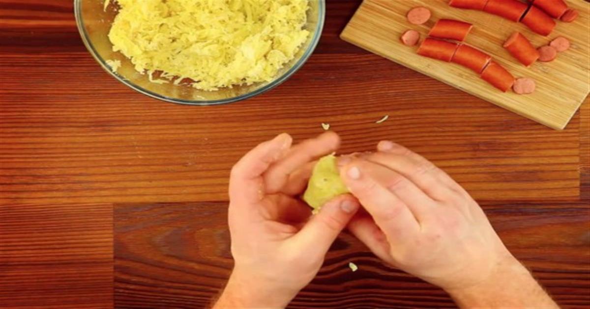 - Βάλτε μία κουταλιά από το μίγμα πατάτας στο χέρι σας, πιέστε το και βάλτε μέσα του ένα χοτ ντογκ. Κλείστε το καλά μέσα στην πατάτα, έτσι ώστε να είναι εντελώς καλυμμένο.