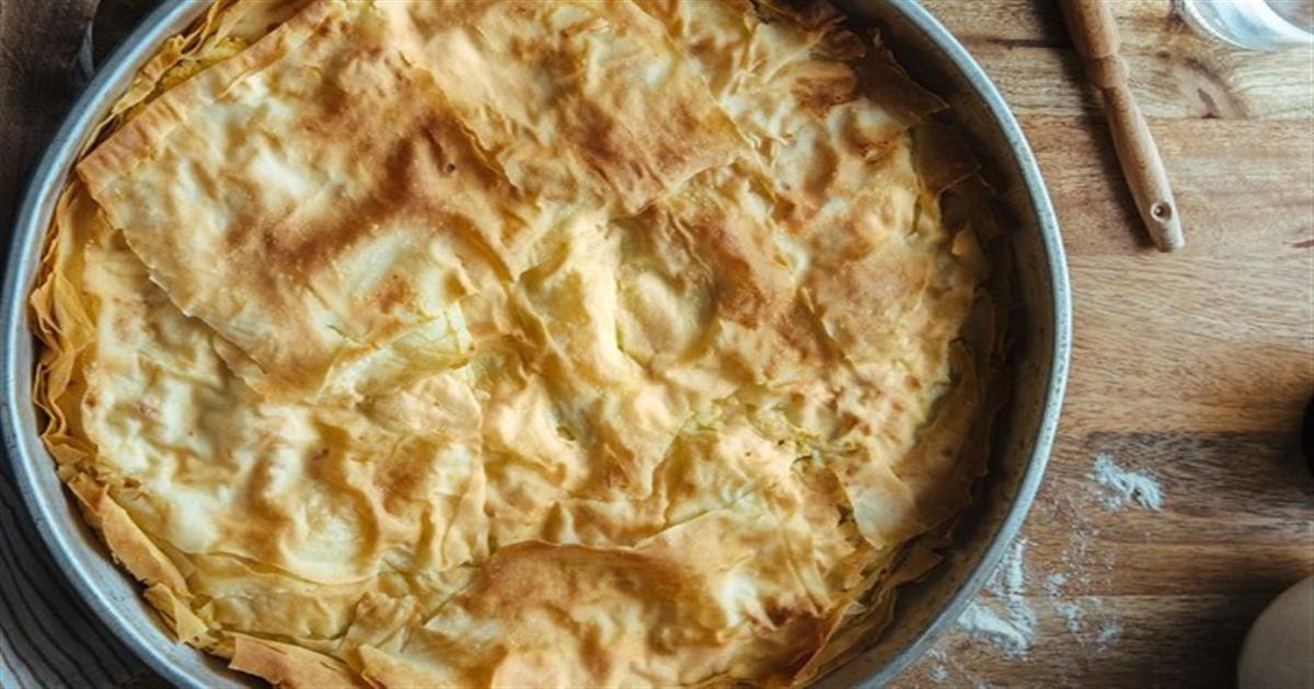 - Περιχύνουμε την επιφάνεια με το υπόλοιπο βούτυρο και αφήνουμε στην άκρη την πίτα για 10 λεπτά, να απορροφήσει ελαφρώς το βούτυρο και τα υγρά της γέμισης. Ψήνουμε χωρίς να τη χαράξουμε σε προθερμασμένο φούρνο στους 170-180°C για 35-40 λεπτά. Την απολαμβάνουμε χλιαρή.