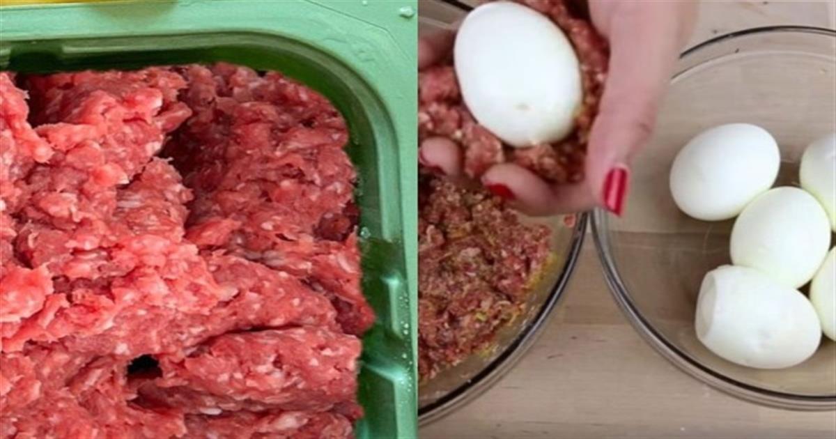 - Λαδώνετε ένα πυρέξ ή ένα ταψί, απλώνετε τον κιμά σχηματίζοντας ένα ορθογώνιο που να χωράει και να σκεπάζει τα αβγά και το τυρί της γέμισης.