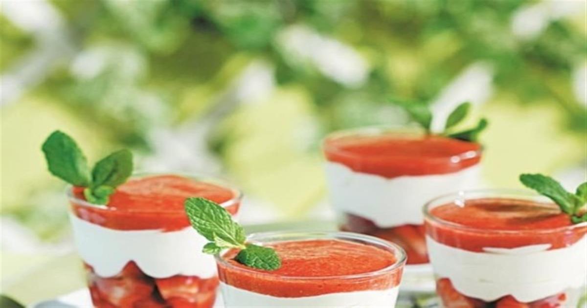 - Για το σερβίρισμα: Παίρνετε τέσσερα χαμηλά ποτήρια και μοιράζετε τις ψιλοκομμένες φράουλες στον πάτο των ποτηριών. Μοιράζετε την κρέμα του τυριού πάνω από τις φράουλες, αφήνοντας 1εκ. περίπου κενό στο ύψος του ποτηριού. Τελειώνετε ρίχνοντας πάνω από την κρέμα μια δύο κουταλιές σούπας από την κρέμα φράουλας που έχετε βάλει στο ψυγείο να παγώνει. Διακοσμείτε με μια κορφούλα δυόσμο και… έτοιμο το γλυκό σας.