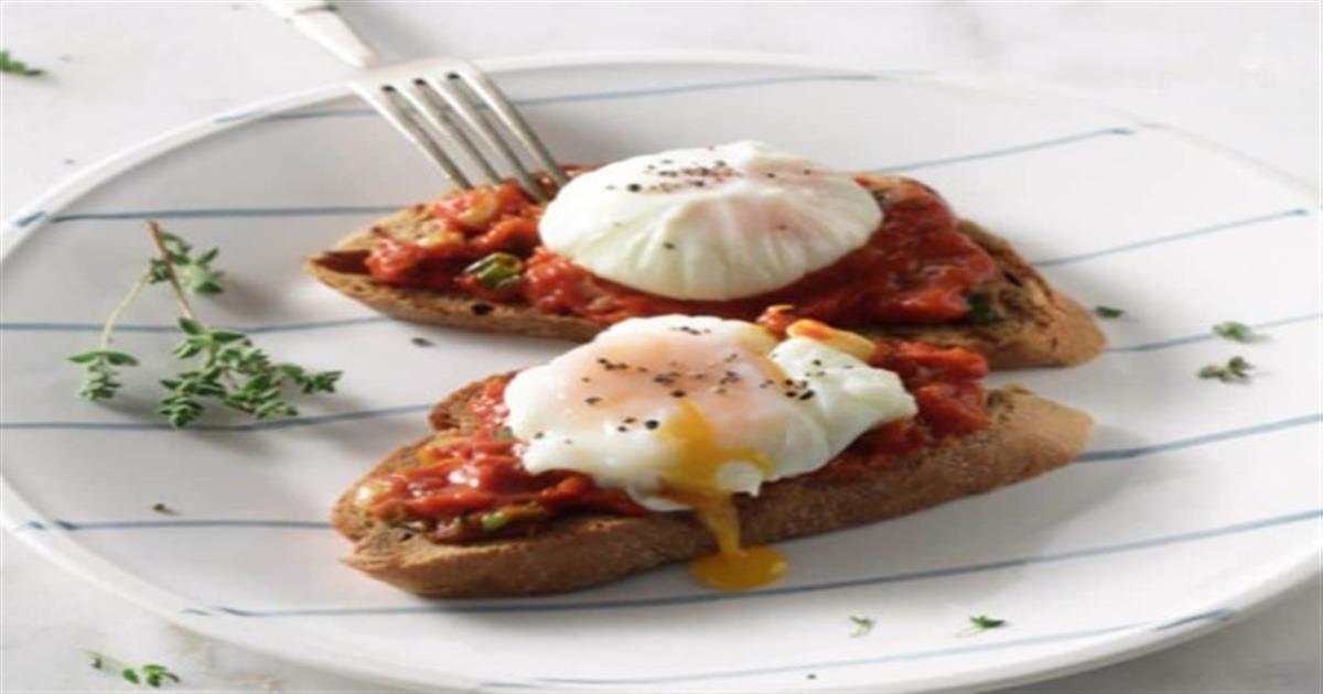 - Ζεσταίνουμε τις φέτες του ψωμιού σε μια φρυγανιέρα ή τοστιέρα. Απλώνουμε πάνω στο ψωμί τη σάλτσα ντομάτας, βάζουμε από πάνω από ένα αυγό ποσέ, αλατοπιπερώνουμε και σερβίρουμε αμέσως.