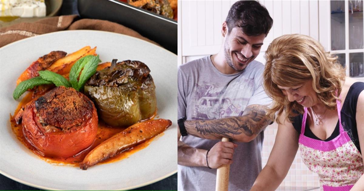 Ειδικότερα, οι ντομάτες και οι πιπεριές γεμιστές με ρύζι και μυρωδικά είναι το αγαπημένο μαμαδίστικο φαγητό, που συνοδεύεται με πατάτες και το προτείνει ο Άκης Πετρετζίκης.