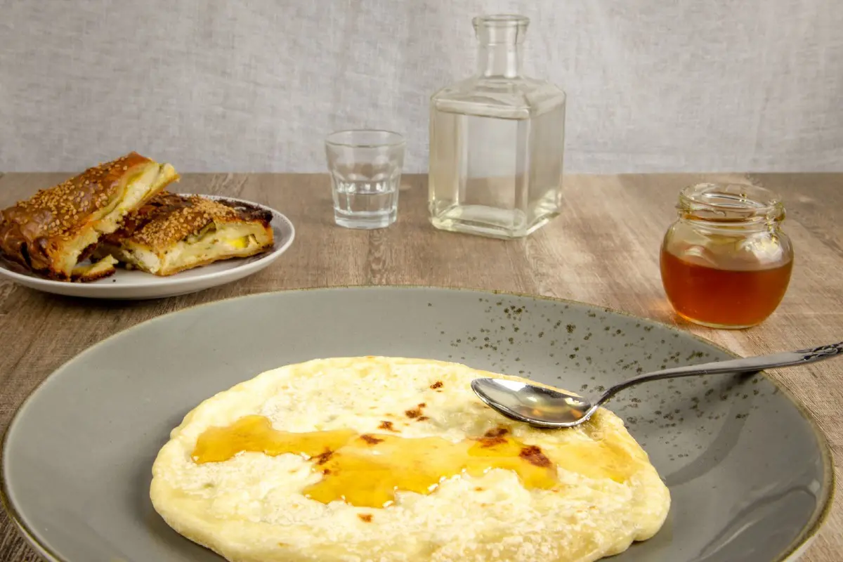 Έτσι σχηµατίζουµε 10 µικρές µπάλες. Τις πιέζουµε ανοίγοντάς τες µε τον πλάστη για να πάρουν και πάλι το στρογγυλό τους σχήµα, µεγέθους ενός µικρού πιάτου. Τις ψήνουµε σε τηγάνι χωρίς λάδι, γυρίζοντάς τες πολύ συχνά για να µην καούν. Σερβίρουµε τις πίτες περιχυµένες µε µέλι.