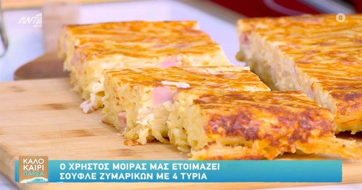 Το σουφλέ ζυμαρικών με τέσσερα τυριά είναι ένα πιάτο τόσο χορταστικό, που δε θα θέλετε να το συνδυάσετε μα κάτι άλλο. Πρόκειται για μία συνταγή, όπου η ελαφριά, αφράτη υφή του σουφλέ συναντά την πλούσια, κρεμώδη ένταση των τυριών.Αυτό το πιάτο, μπορείτε να το μαγειρέψετε χωρίς κανένα ιδιαίτερο κόπο και αποτελεί μια ιδανική και γρήγορη επιλογή για το τραπέζι σας, ως κυρίως γεύμα. Ο Χρήστος Μοίρας δ…