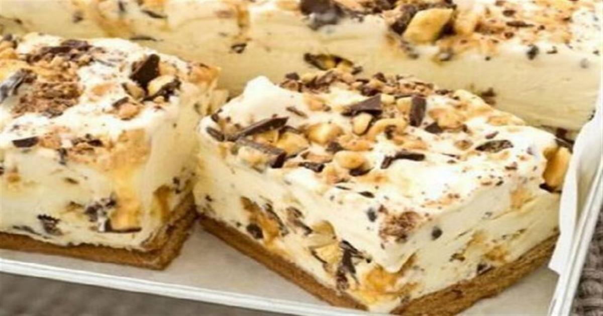 Τα βάζετε στη κατάψυξη για ένα βράδυ, ή μέχρι να σταθεροποιηθεί και παγώσει καλά το μείγμα. Πριν σερβίρετε βγάζετε το γλυκό σας από τη κατάψυξη το αφήνετε για 10 λ σε θερμοκρασία δωματίου και μετά το κόβετε σε κομμάτια και σερβίρετε.