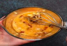 - Σε μπολ ανακατεύουμε όλα τα υλικά για τη μαρινάδα του κοτόπουλου. Κρατάμε στην άκρη 50 ml για τη σαλάτα.