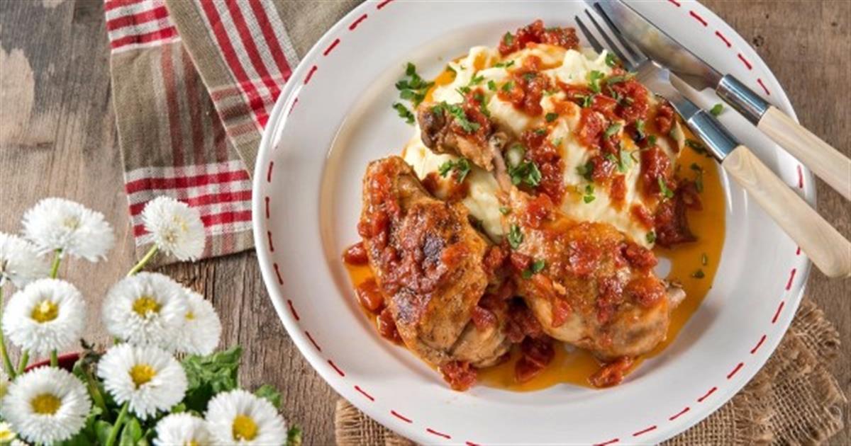 - Μεταφέρετε το κοτόπουλο και τον πουρέ σε πιάτα. Περιχύστε με τη σάλτσα του κοτόπουλου, πασπαλίστε με ψιλοκομμένο μαϊντανό και σερβίρετε.