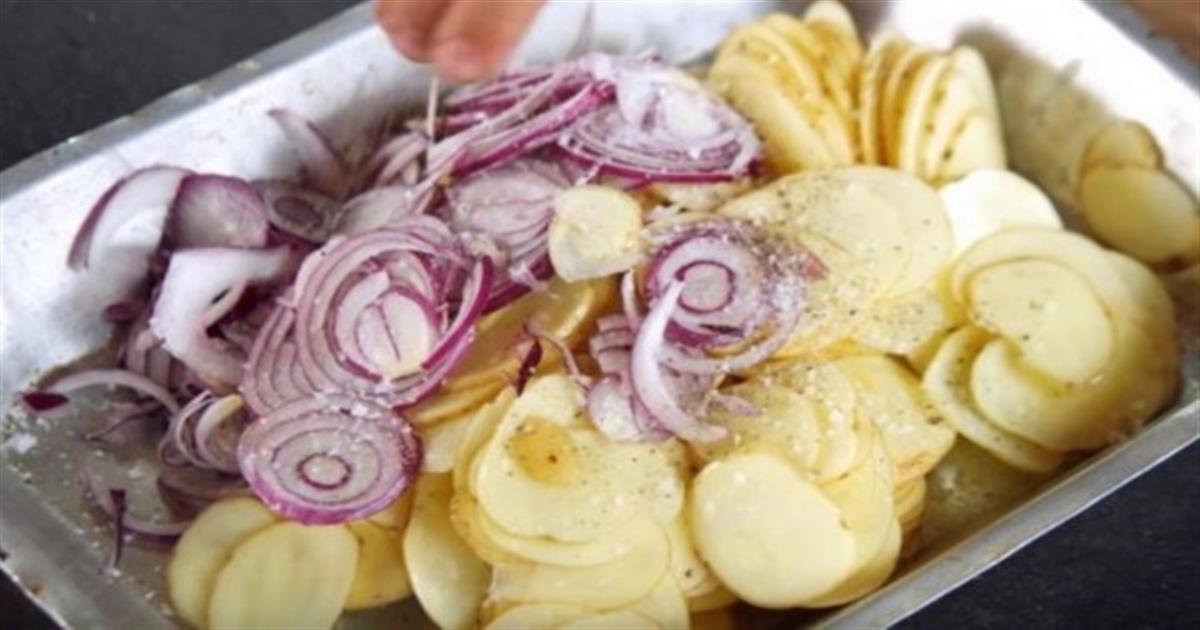 Ξεκινά με μερικές φέτες πατάτας και προσθέτει κόκκινο κρεμμύδι κομμένο σε φέτες για μια έκρηξη γεύσης. Λάβετε υπόψη σας ότι η σκληρότητα του κρεμμυδιού θα μετριαστεί, γι” αυτό μη διστάσετε να προσθέσετε επιπλέον γεύση.