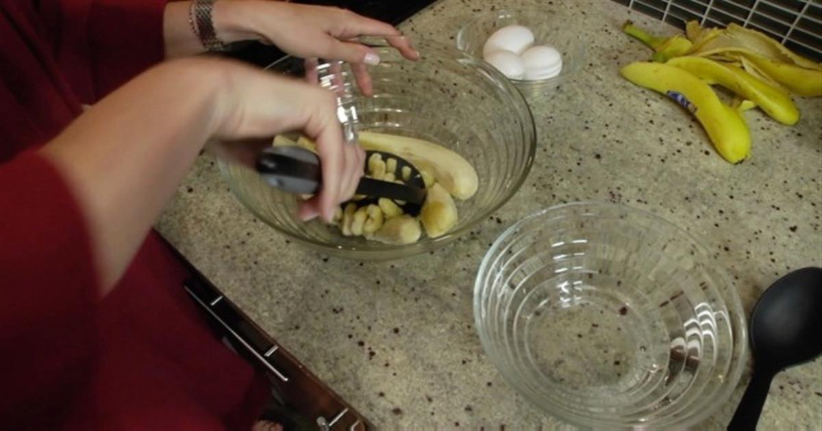 - Ρίξτε τα αυγά στο μπολ με τις λιωμένες μπανάνες και ανακατέψτε καλά.